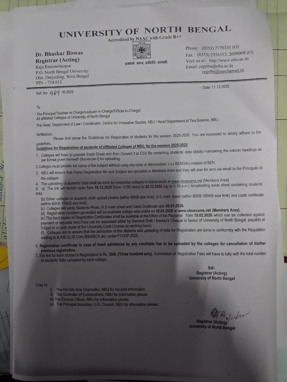 Notice for Guidelines for Registration of Students